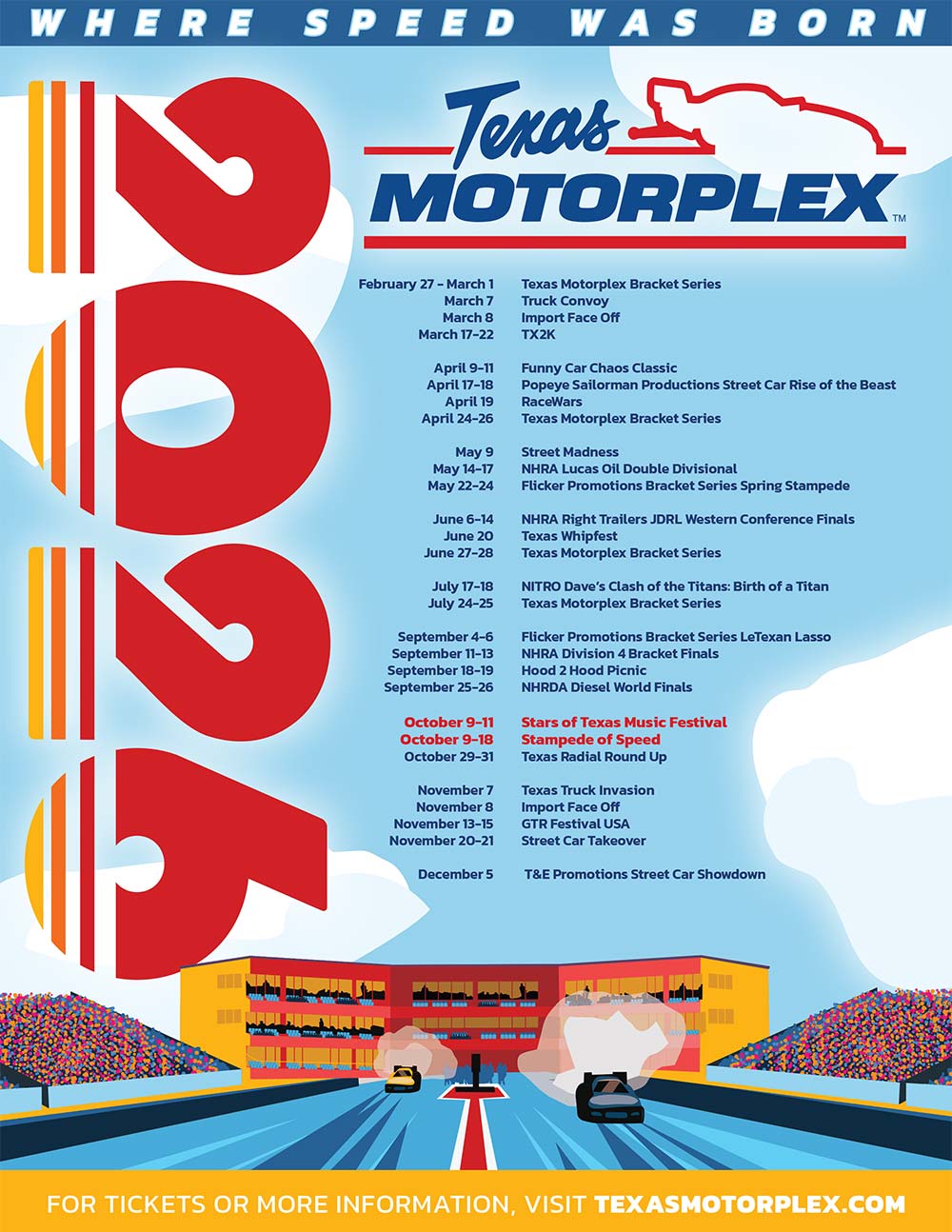 ENNIS, TX (December 9, 2025) --- Heading into 2026 after one of the most successful seasons in Texas Motorplex history, the world famous all-concrete race track and multi-use facility will be looking to expand its family friendly events and races this season. With a long history of hosting some of the biggest drag racing events in the country and on the heels of one of the largest music festivals in the state of Texas last year, the 6th annual Stampede of Speed, October 9-14, will once again feature the fastest motorsports in the world during the 41st Texas Fall Nationals, October 14-18 and the biggest names in country music October 9-11 during the Stars of Texas Music Festival. The track will also host a wide variety of national and regional events including the NHRA Right Trailers Junior Dragster Western Conference Finals.